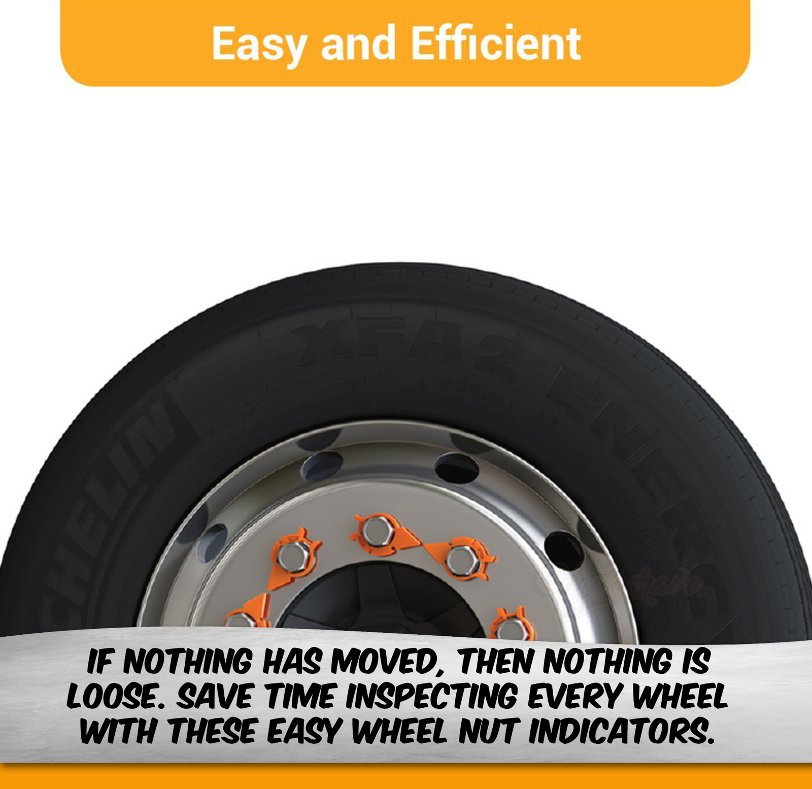 • Using wheel nut indicators are an easy way to save time and improve safety by allowing the driver to clearly monitor the status of each wheel.