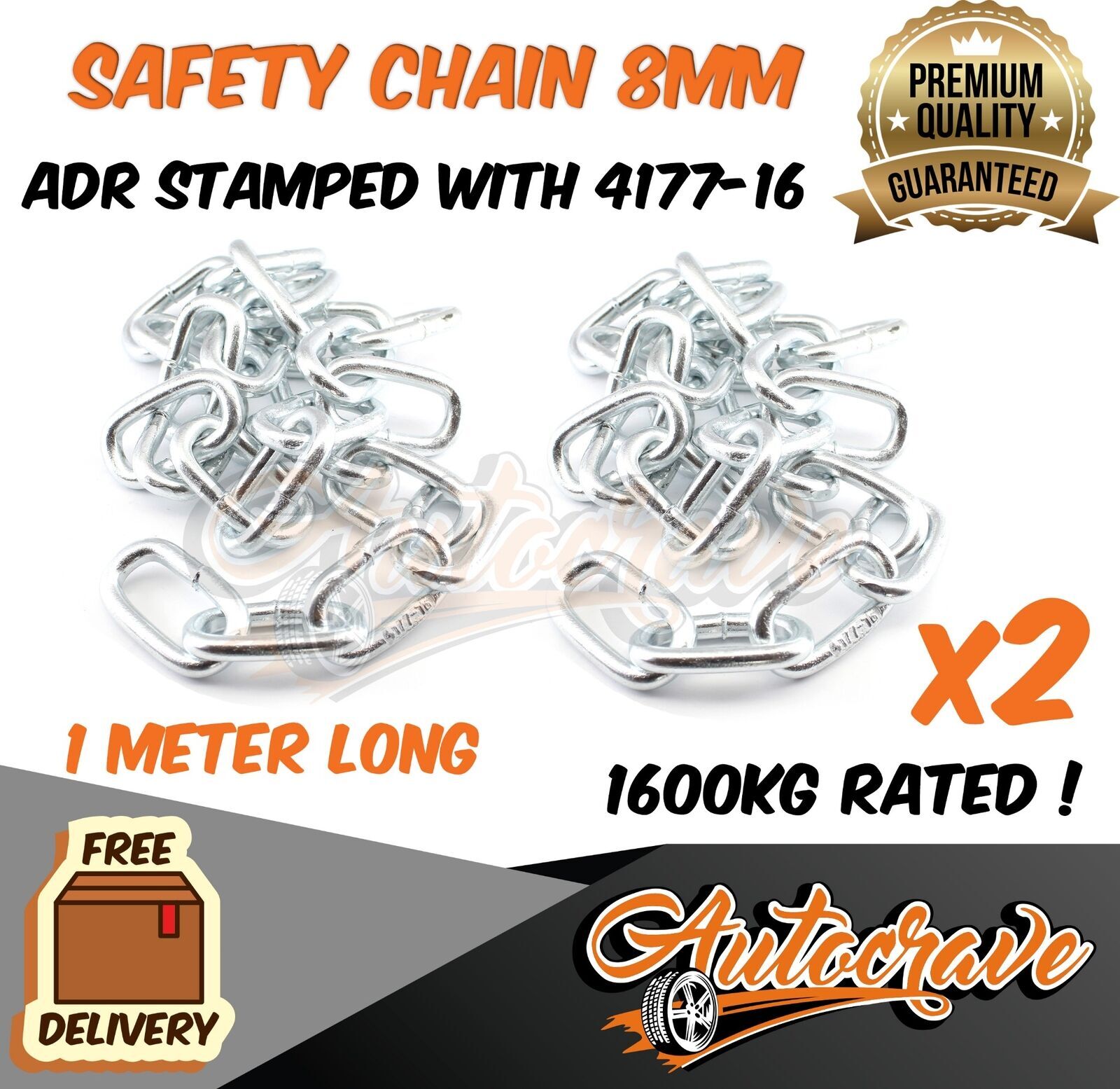 2x 8mm Trailer Safety Rated Stamped Chain ADR STAMPED Caravan Boat Chain ZINC