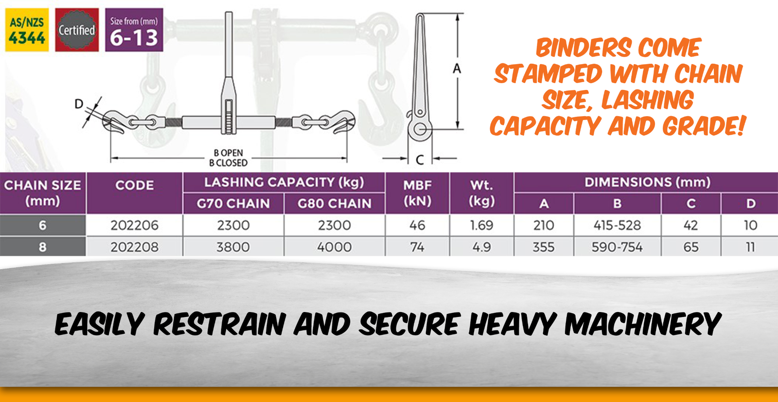 • Our ratchet-style load binder, paired with Grade 70 Chain and grab hooks, offers a reliable solution for restraining heavy loads during transportation, such as excavators.