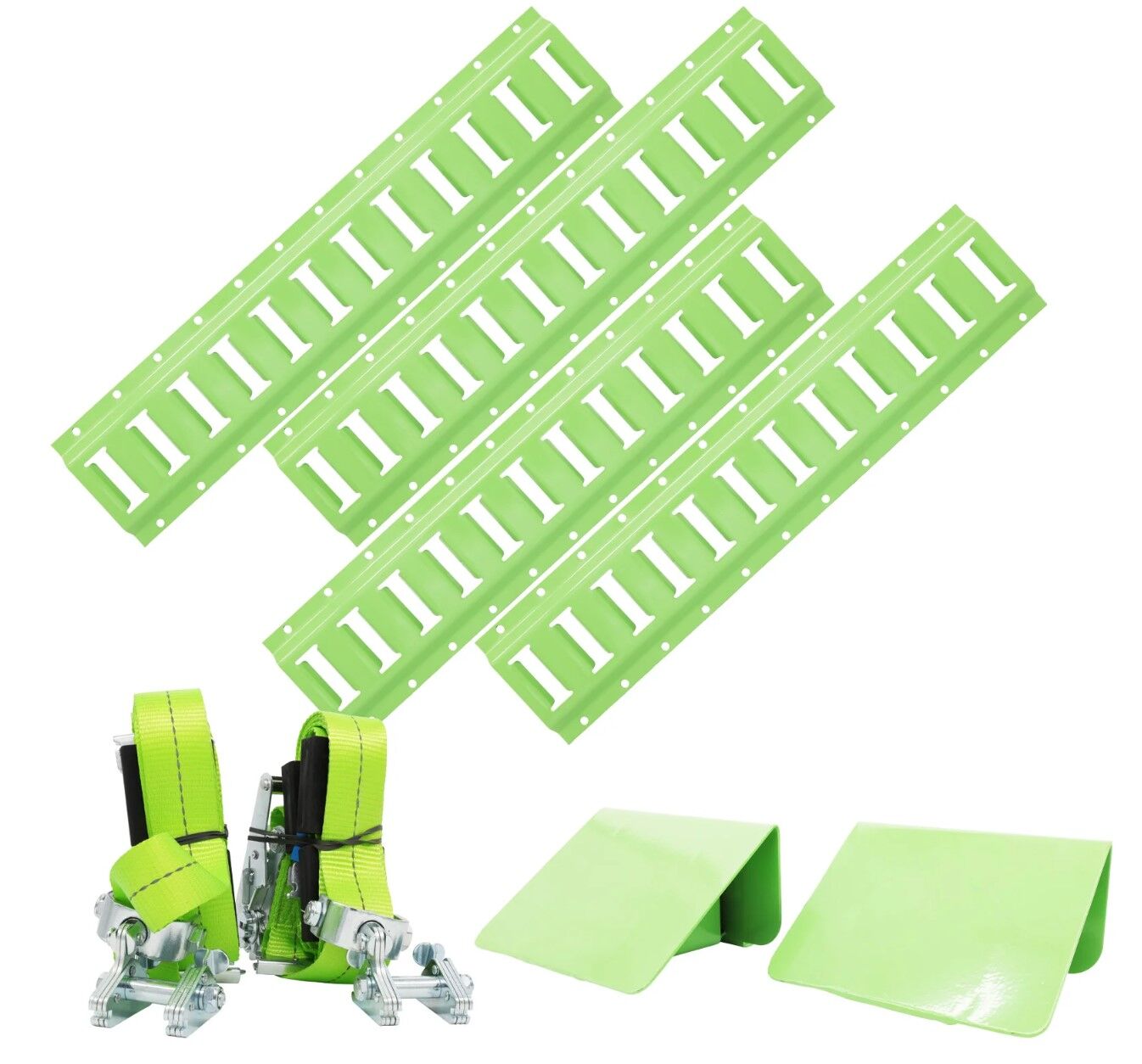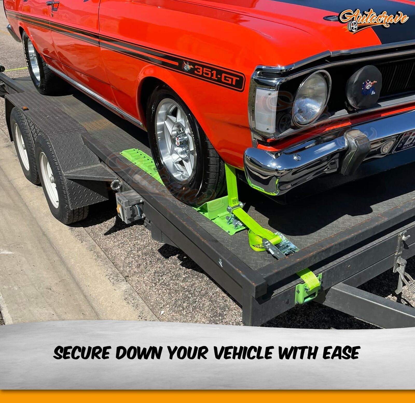 • This kit includes heavy duty fluorescent webbed straps with 'E' fittings designed to slot into wheel chocks- ideal for lowered cars, Quad bikes or