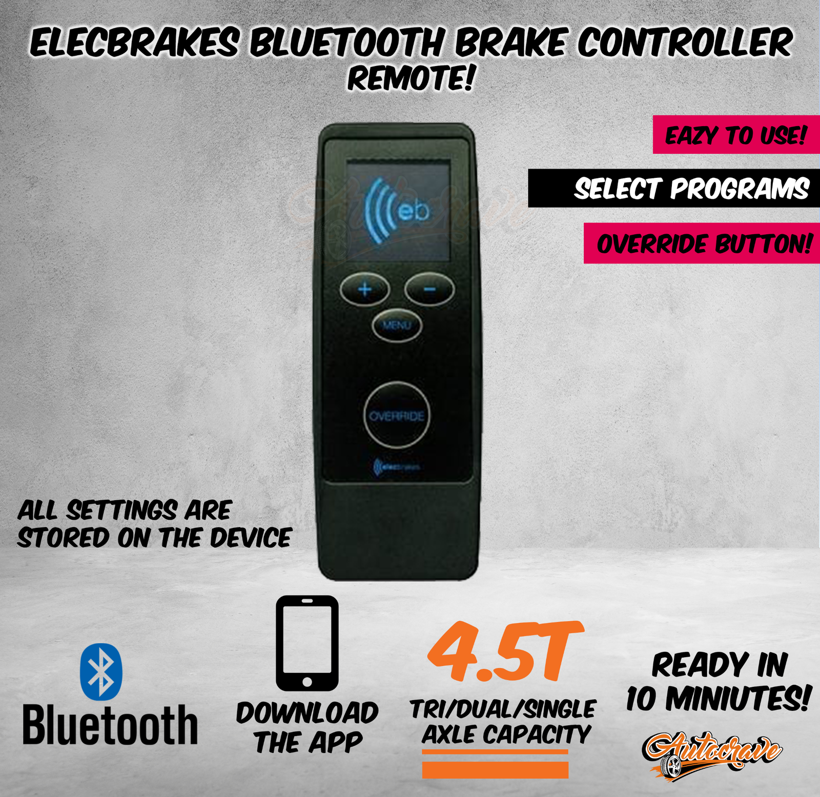 Elecbrakes is the electric brake controller redefining towing. It has completely eliminated the need to modify your tow vehicle. Now you can use any capable vehicle for towing your load. Choose your Plug & Play model to be on the road in as little as 10 minutes. it's proportional brake controller automatically calibrates and activates the trailer brakes based on your driving for a seamless towing experience. Use the wireless in-car remote to monitor and adjust settings while on the move. Please note this listing includes ONLY the remote and not the complete unit!
