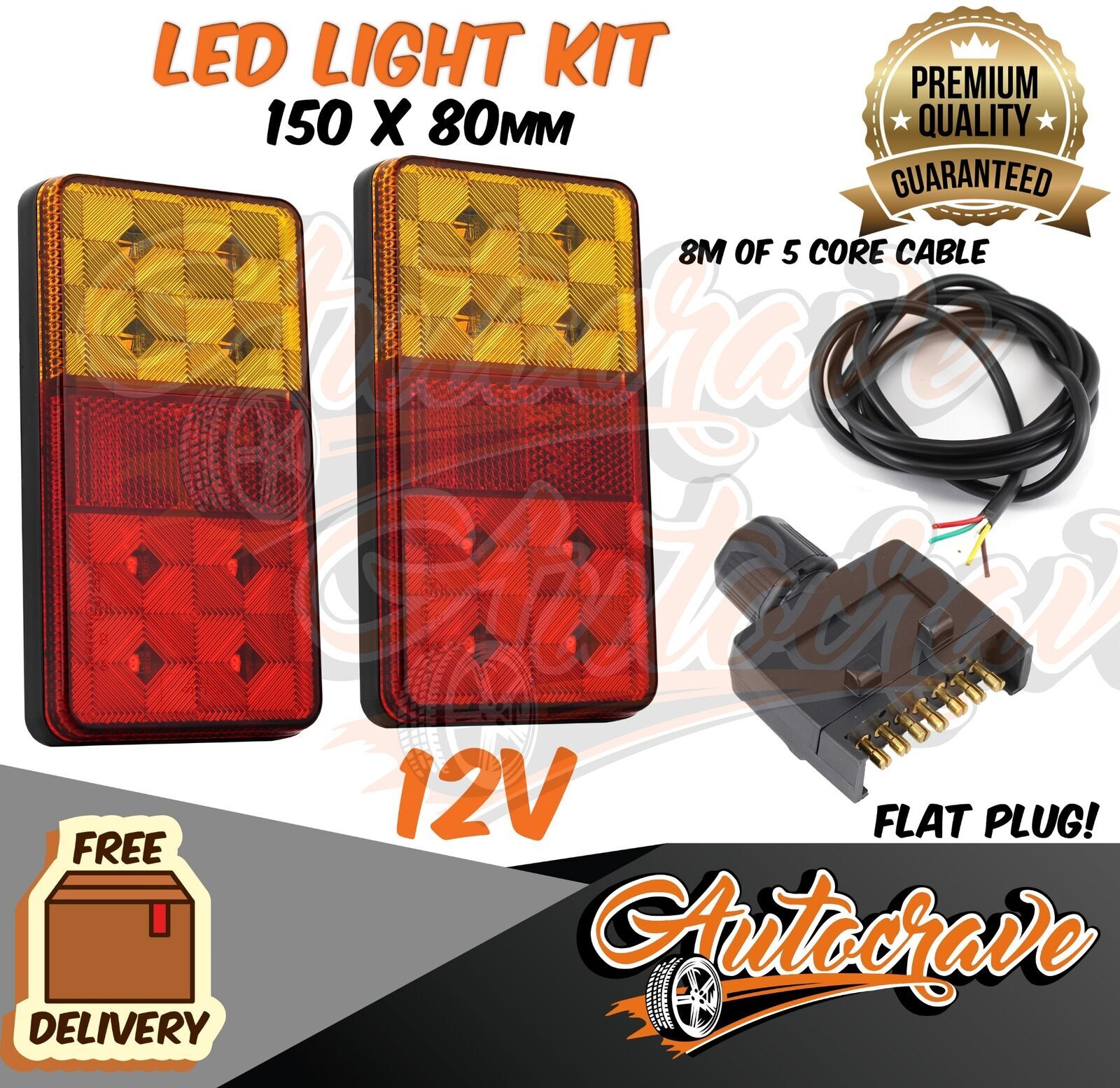 LED TRAILER TAIL LIGHT KIT PAIR FLAT PLUG 5 CORE WIRE CARAVAN BOAT 150x80mm