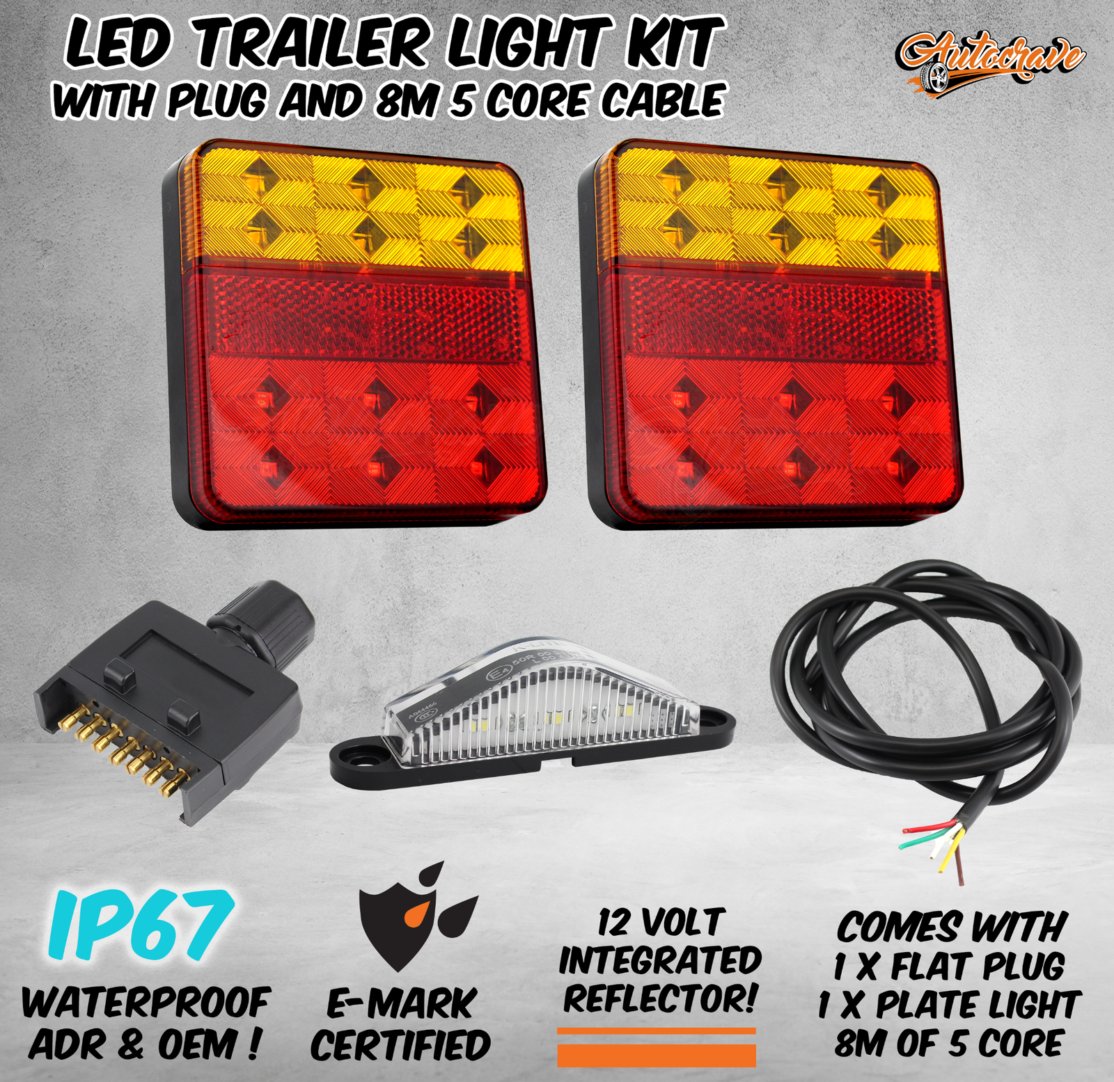 Pair Of 12 LED Trailer Lights Kit - 1x Number Plate, Plug, 8m x 5 Core Cable 12V